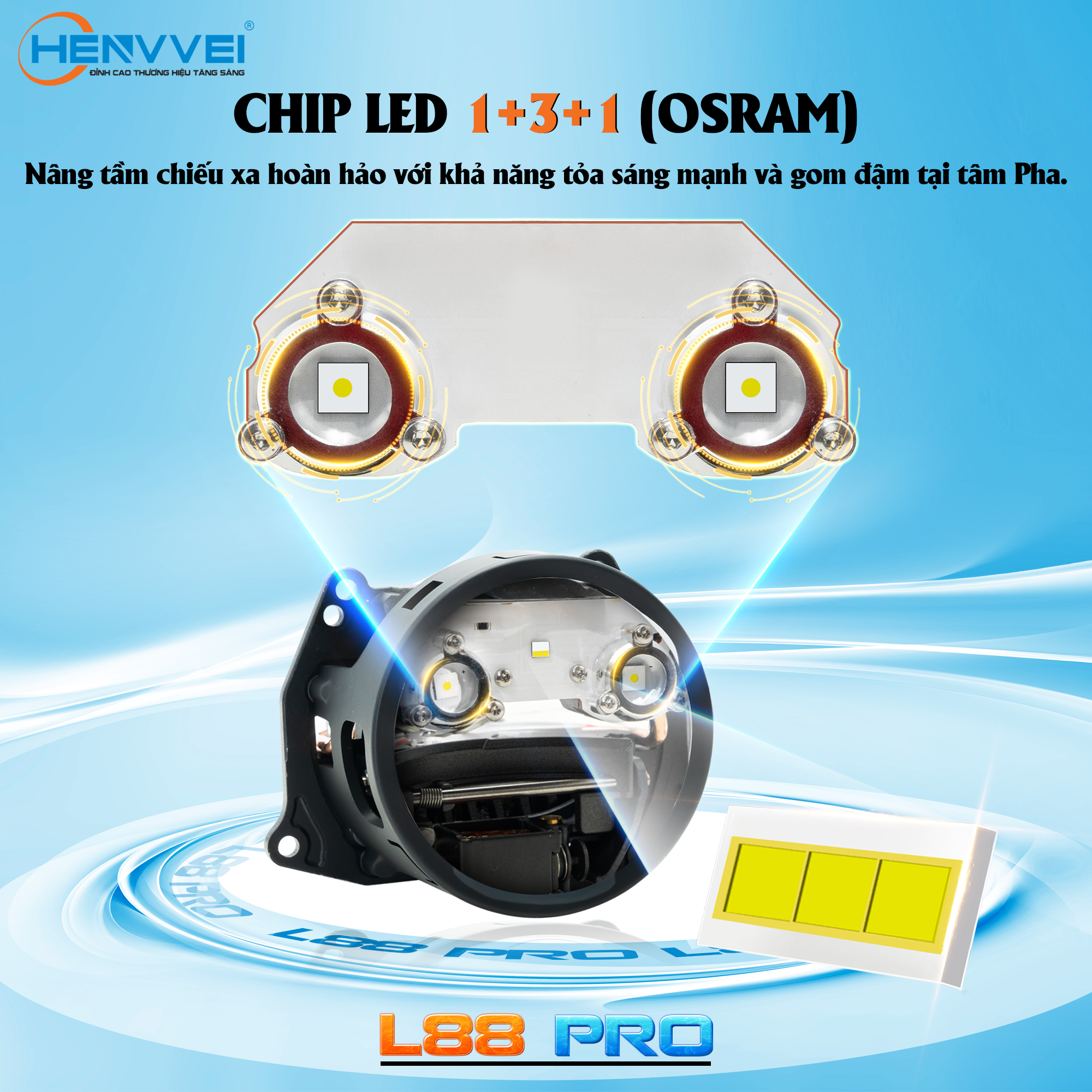 Nếu yêu thích công nghệ hiện đại và đang tìm kiếm dòng đèn bi LED có chất lượng ánh sáng Pha mạnh mẽ vượt trội thì đèn bi LED L88 Pro của nhà Henvvei chính là một lựa chọn tuyệt vời. Đèn bi LED Henvvei L88 Pro tăng cường sức mạnh ánh sáng pha bằng cụm 3 đèn trợ pha được sử dụng từ công nghệ Osram.